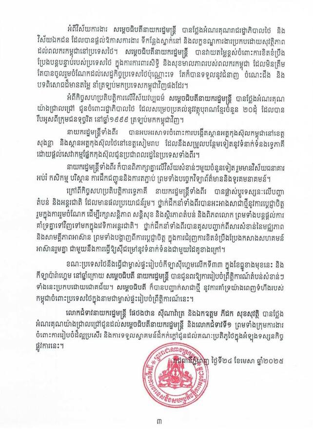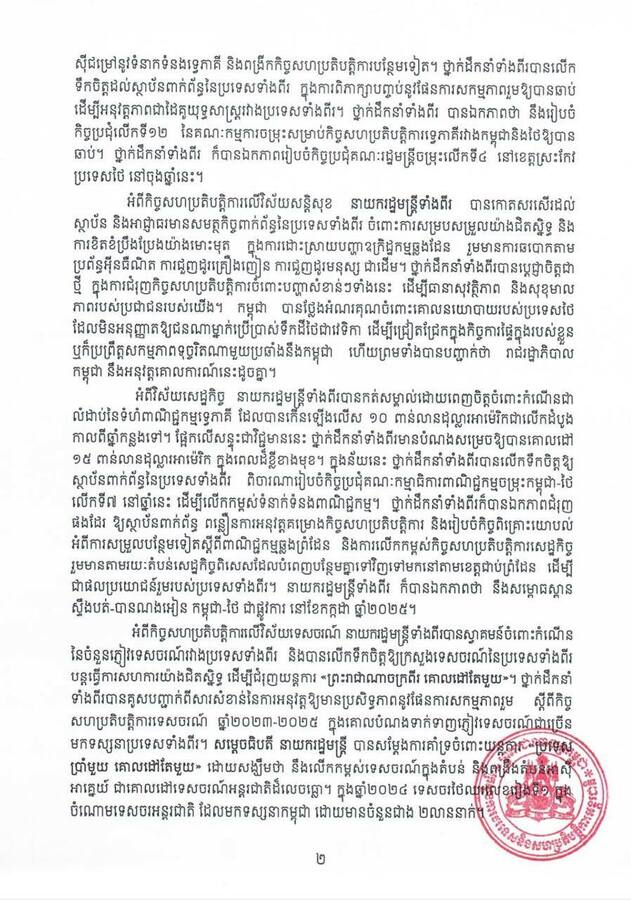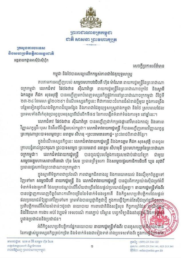 កម្ពុជា និងថៃ សន្យាលើកកម្ពស់ភាពជាដៃគូយុទ្ធសាស្ត្រ នយោបាយនយោបាយ និងការបរទេសព័ត៌មានផ្សេងៗរដ្ឋសភាជាតិរាជរដ្ឋាភិបាលសម្តេចធិបតីសេដ្ឋកិច្ច/ពាណិជ្ជកម្ម April 24, 2025