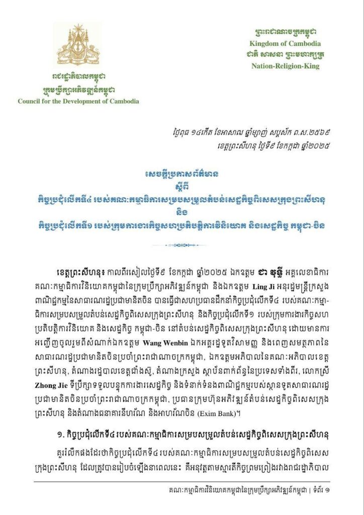 (ព្រះសីហនុ)៖ ឯកឧត្តម ជា វុទ្ធី អគ្គលេខាធិការគណៈកម្មាធិការវិនិយោគកម្ពុជា នៃក្រុមប្រឹក្សាអភិវឌ្ឍន៍កម្ពុជា និងឯកឧត្តម Ling Ji អនុរដ្ឋមន្រ្តីក្រសួងពាណិជ្ជកម្មចិន នៅរសៀលថ្ងៃទី៩ ខែកក្កដា ឆ្នាំ២០២៥ បានធ្វើជាសហប្រធានដឹកនាំកិច្ចប្រជុំលើកទី៤ របស់គណៈកម្មាធិការសម្របសម្រួល តំបន់សេដ្ឋកិច្ចពិសេស ក្រុងព្រះសីហនុ និងកិច្ចប្រជុំលើកទី១ របស់ក្រុមការងារកិច្ចសហប្រតិបត្តិការវិនិយោគ និងសេដ្ឋកិច្ចកម្ពុជា-ចិន។