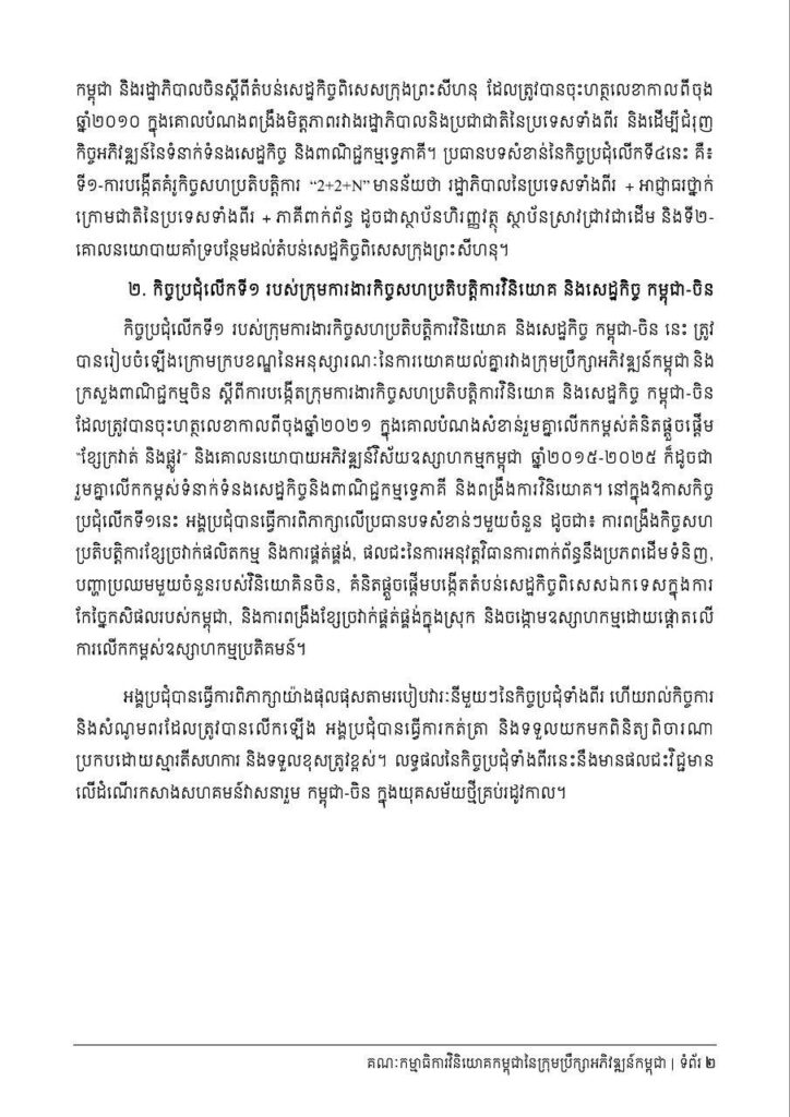 កិច្ចប្រជុំនេះ ដើម្បីអនុវត្តយន្តការការងារក្នុងក្របខណ្ឌកិច្ចព្រមព្រៀងទ្វេភាគី រវាងរាជរដ្ឋាភិបាលកម្ពុជា និងរដ្ឋាភិបាលចិន និងកិច្ចសហប្រតិបត្តិការទ្វេភាគី ក្នុងក្របខណ្ឌអនុស្សារណៈយោគយល់គ្នា រវាងក្រុមប្រឹក្សាអភិវឌ្ឍន៍កម្ពុជា និងក្រសួងពាណិជ្ជកម្មចិន ក្នុងគោលបំណងបន្តជំរុញកិច្ចអភិវឌ្ឍន៍តំបន់សេដ្ឋកិច្ច ពិសេសក្រុងព្រះសីហនុ និងបន្តជំរុញលើកកម្ពស់កិច្ចសហប្រតិបត្តិការសេដ្ឋកិច្ច ពាណិជ្ជកម្ម និងវិនិយោគរវាងប្រទេសទាំងពីរកម្ពុជា-ចិន។