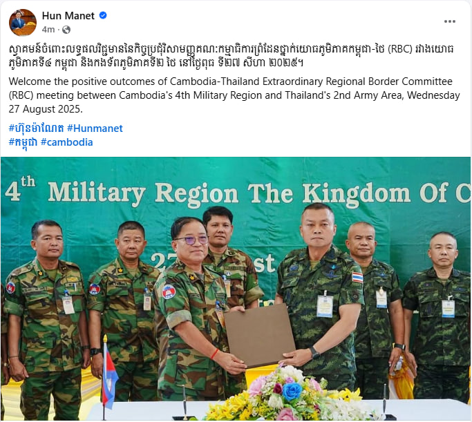 (ភ្នំពេញ)៖ សម្តេចបវរធិបតី ហ៊ុន ម៉ាណែត នាយករដ្ឋមន្ត្រីនៃកម្ពុជា នៅមុននេះ បានប្រកាសតាមបណ្តាញសង្គម ស្វាគមន៍ចំពោះលទ្ធផលវិជ្ជមាននៃកិច្ចប្រជុំវិសាមញ្ញគណៈកម្មាធិការព្រំដែនថ្នាក់យោធភូមិភាគកម្ពុជា-ថៃ (RBC) រវាងយោធភូមិភាគទី៤ កម្ពុជា និងកងទ័ពភូមិភាគទី២ ថៃ នៅថ្ងៃពុធ ទី២៧ សីហា ២០២៥។